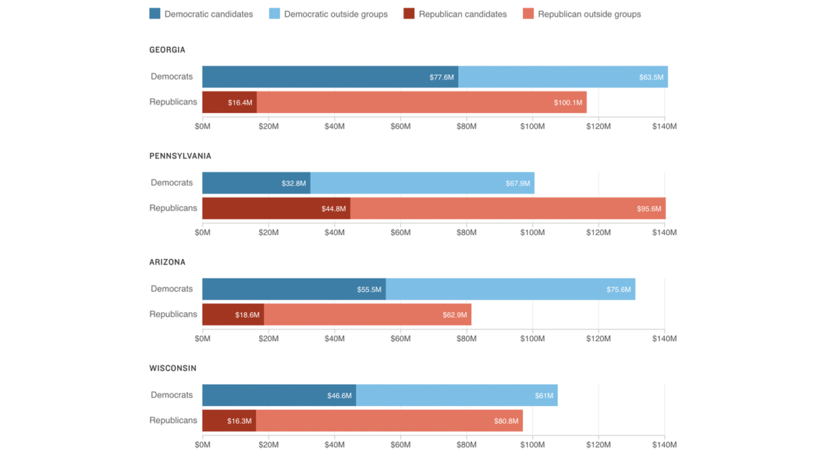 Outside groups have spent nearly $1 billion to boost Republican Senate candidates. Almost 90%, in fact, of pro-GOP TV ads are paid for by outside groups, compared to 55% for Democrats.