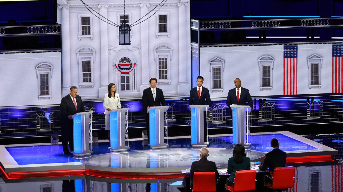 Republican presidential candidates former New Jersey Gov. Chris Christie, former U.N. Ambassador Nikki Haley, Florida Gov. Ron DeSantis, Vivek Ramaswamy and South Carolina Sen. Tim Scott participate in the NBC News Republican Presidential Primary Debate on Wednesday in Miami.