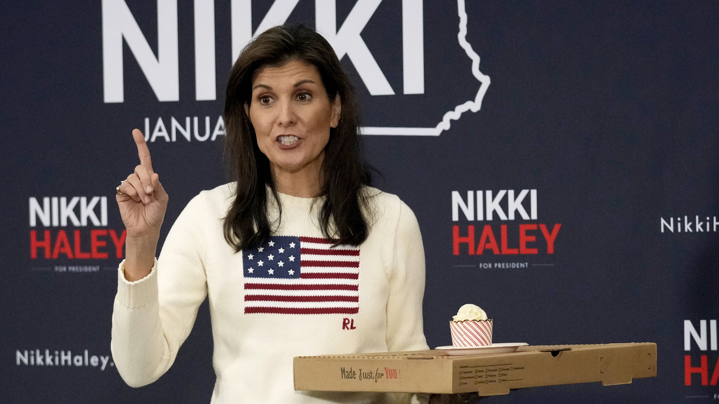 Republican presidential candidate former UN Ambassador Nikki Haley tells the audience the best birthday present they can give her is their vote on Tuesday while speaking at a Pizza and Politics event at Franklin Pierce University, Saturday, Jan. 20, 2024, in Rindge, N.H.
