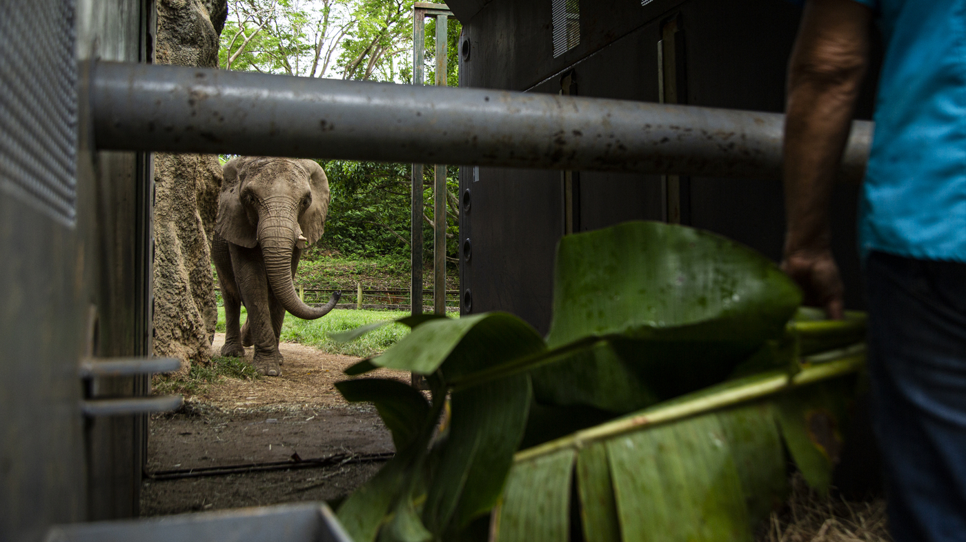 MAYAGÜEZ, Puerto Rico: Carol Buckley works to coax Mundi into the transport cage that will carry her from the Puerto Rico zoo to Buckley’s elephant refuge in Georgia. Buckley worked for two weeks to earn the elephant’s trust. See the story.
